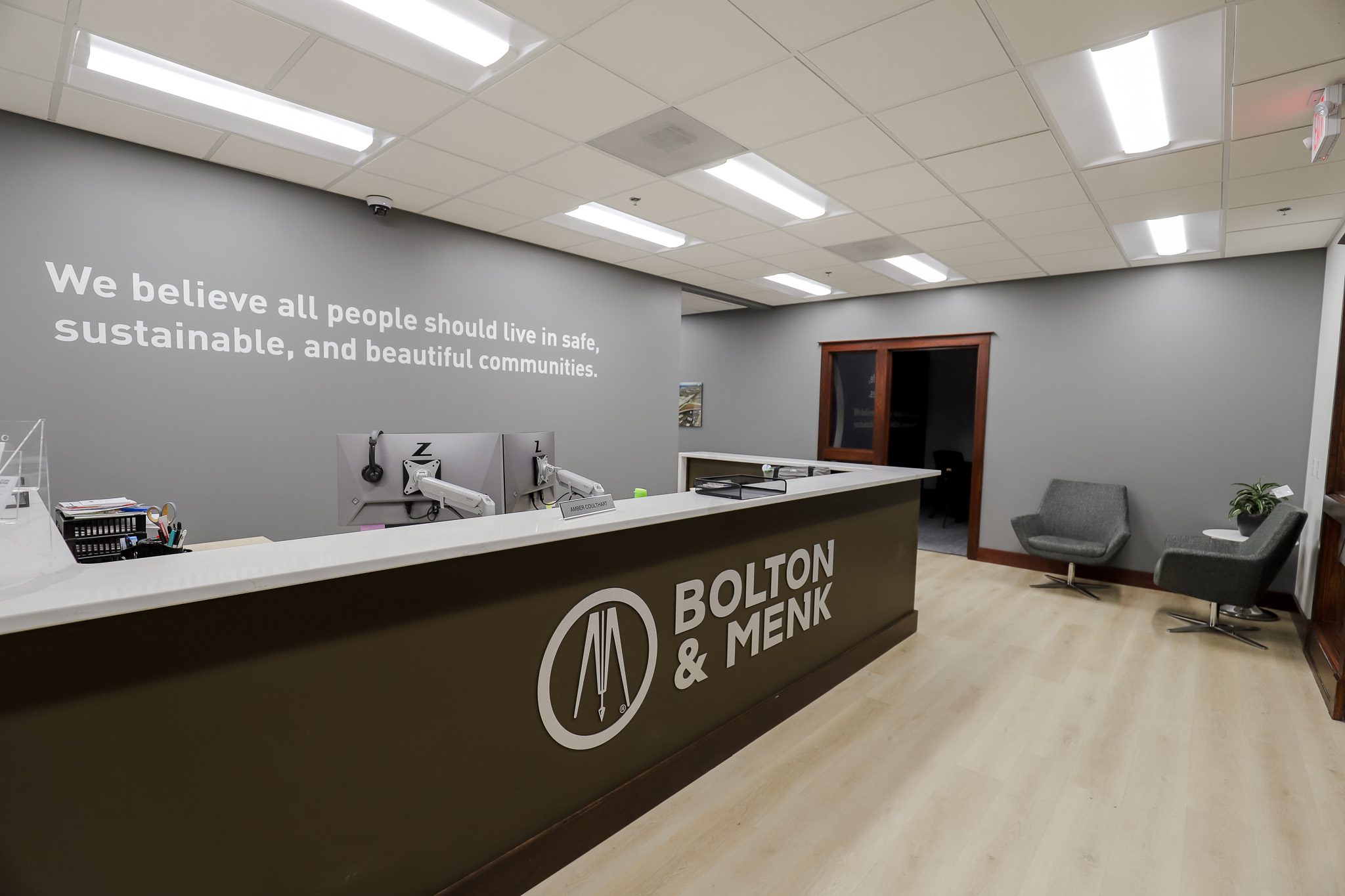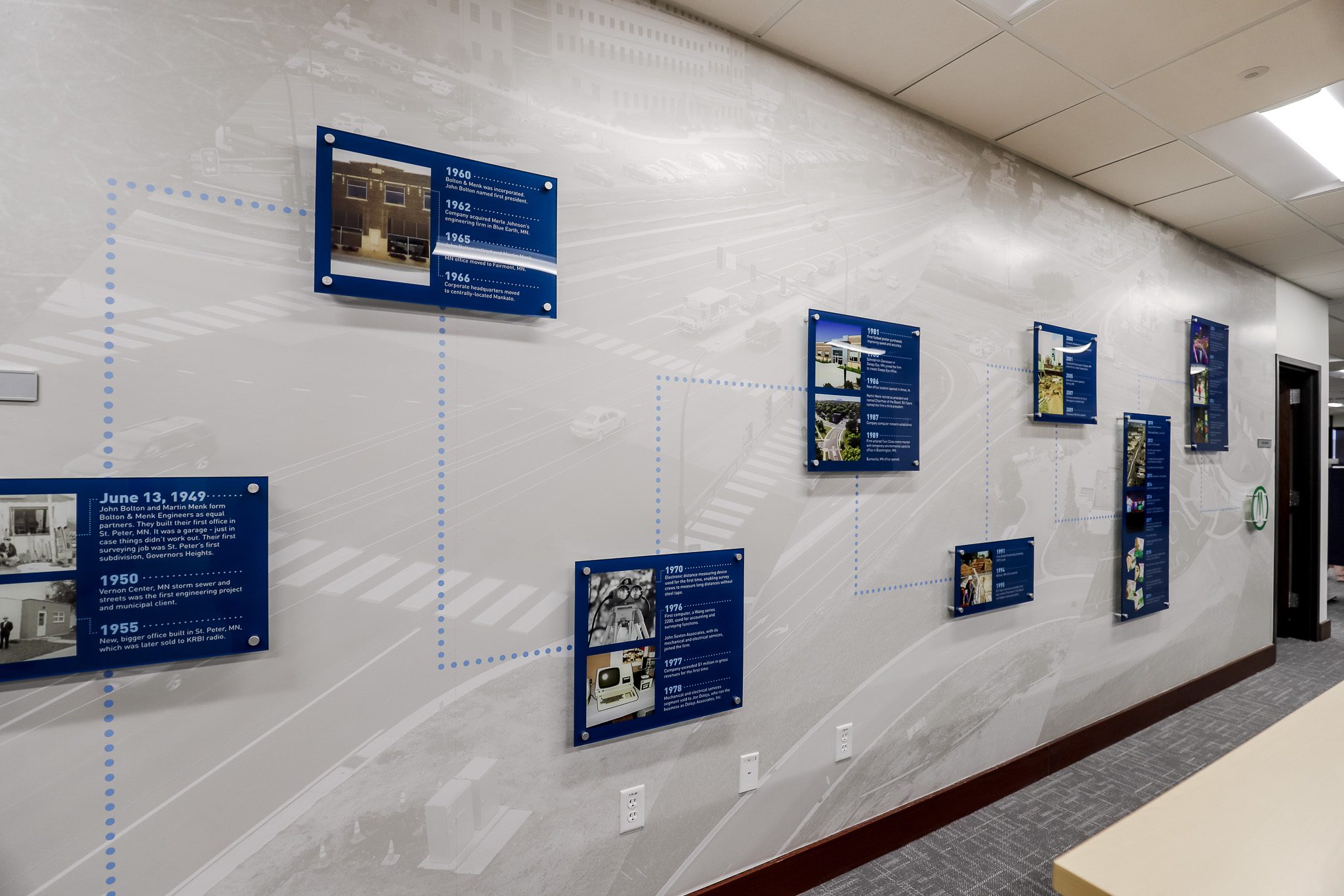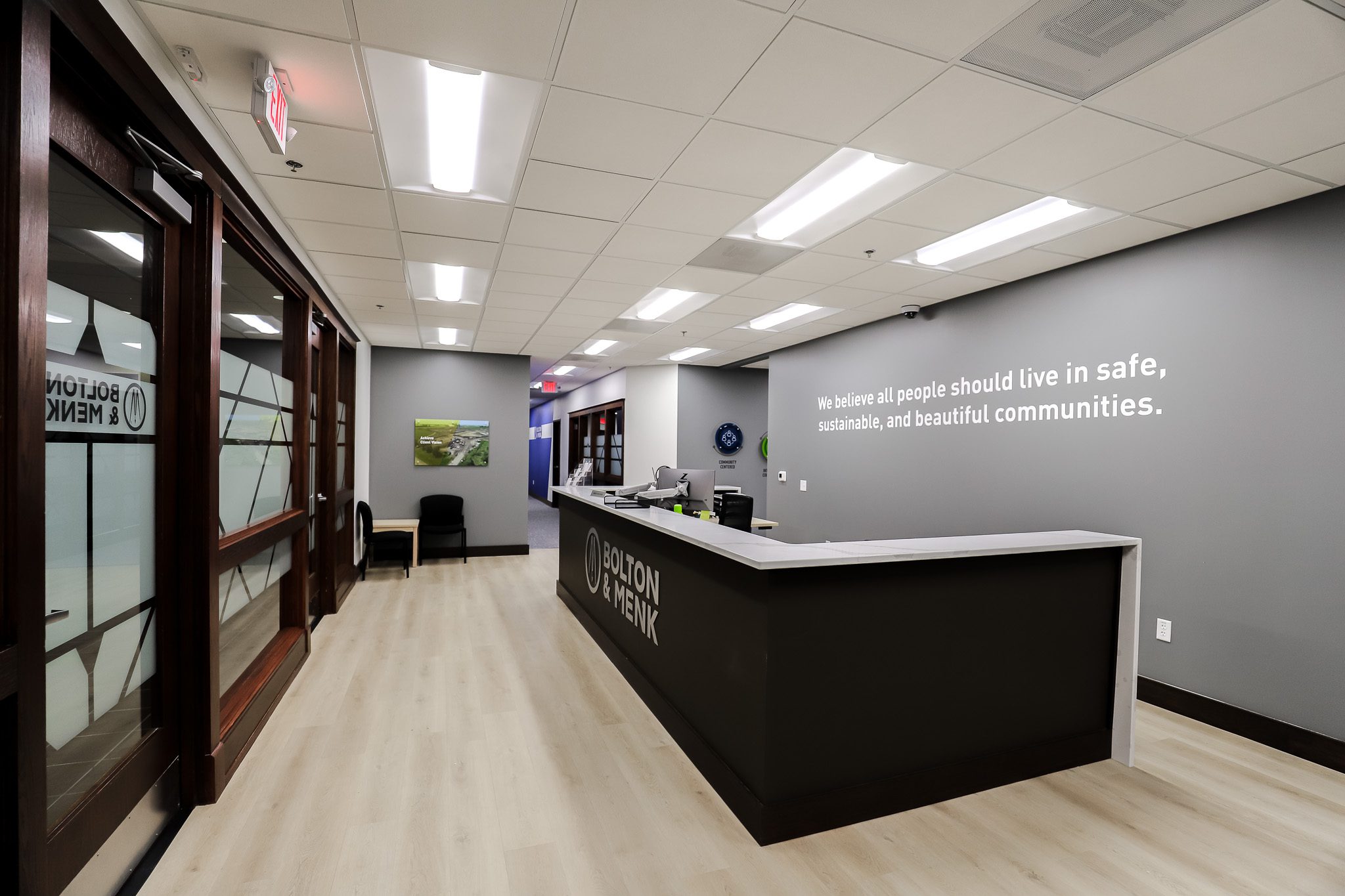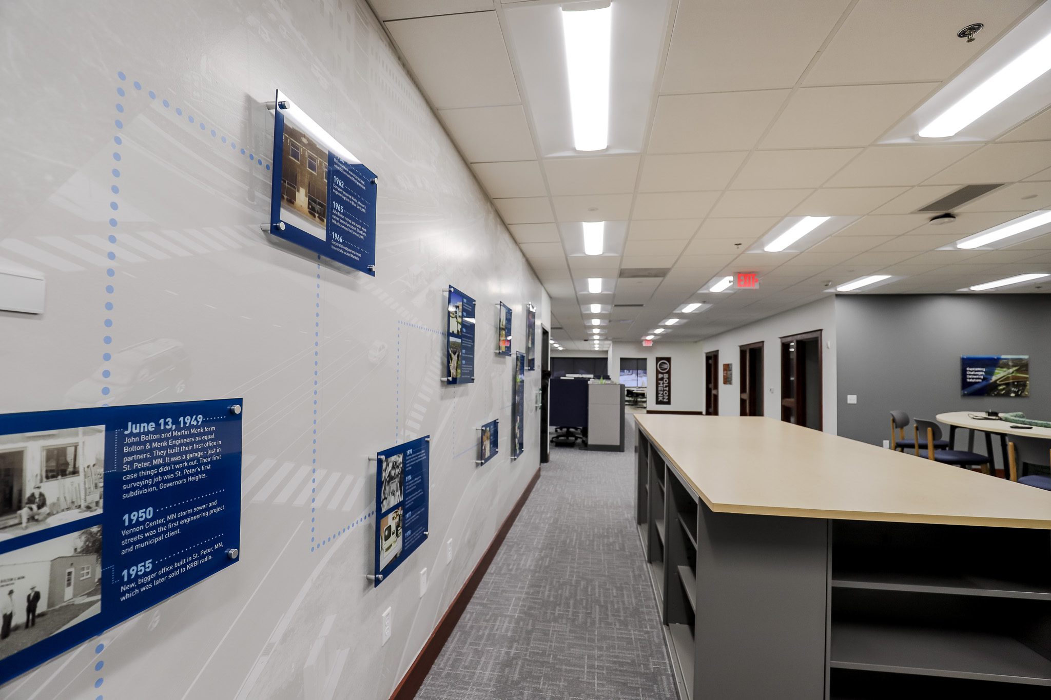 The updated layout is built around collaboration, anchored by a large curved seating area with dual displays. At the front desk, a subtle waterfall countertop adds a clean, modern touch. A wall-sized timeline featuring a photographic mural with floating elements highlights key moments in the firm’s history, adding visual interest while telling a story.